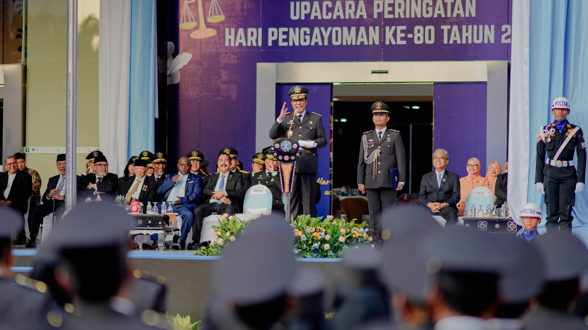 Bertindak sebagai pembina upacara, Menteri Hukum Republik Indonesia, Supratman Andi Agtas, dalam sambutannya menegaskan bahwa usia delapan dekade Pengayoman bukan hanya perayaan, tetapi momentum untuk mengukur sejauh mana hukum benar-benar hadir melindungi rakyat.