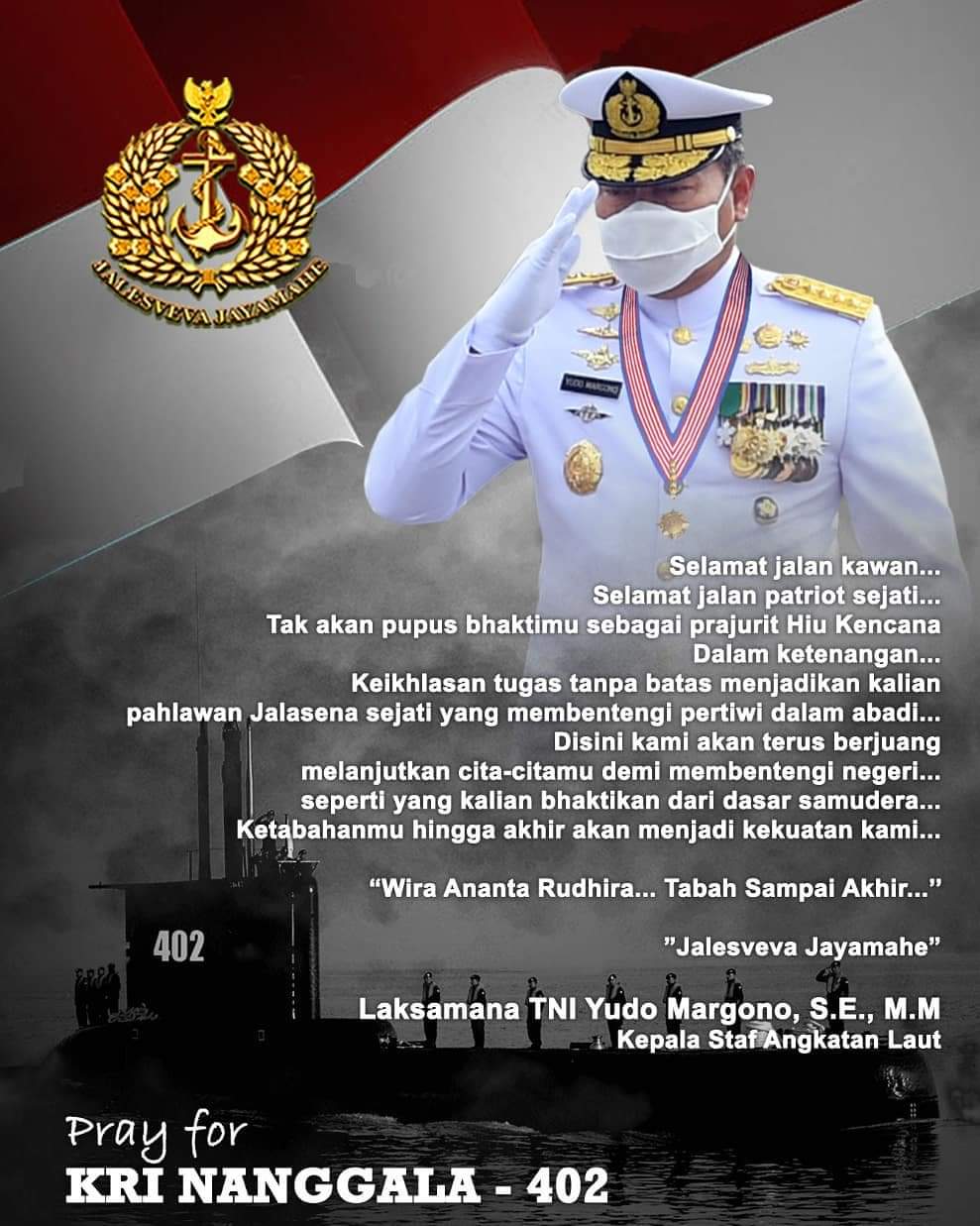 “Selaku Kepala Staf Angkatan Laut dan atas nama keluarga besar TNI Angkatan Laut, saya mengajak kita senantiasa mendo’akan para prajurit kesatria KRI Nanggala-402, semoga Tuhan Yang Maha Kuasa, Allah Subhanahu Wata’ala memberikan tempat terbaik dan mulia bagi mereka semua di sisi-Nya,” kata Yudo dalam keterangan resmi Dinas Penerangan Angkatan Laut pada (30/4/2021).