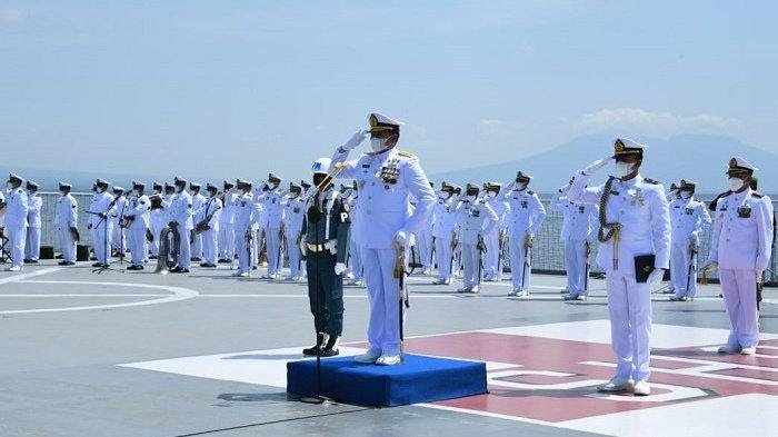Bali, Karosatuklik.com – Kepala Staf Angkatan Laut (KSAL) Laksamana TNI Yudo Margono memimpin Upacara Tabur Bunga bersama keluarga awak KRI Nanggala-402 di geladak KRI dr Soeharso (SHS)-990 yang berlayar di perairan Selat Bali, Jumat (30/4/2021).