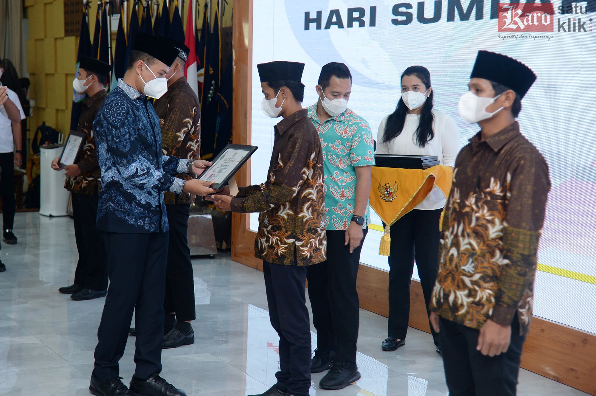Peringatan Sumpah Pemuda ke-92 Provinsi Sumut juga dirangkai dengan penyerahan piagam penghargaan dan tali asih oleh Wagub Musa Rajekshah dan Sekda Sabrina kepada delapan pemenang Pemilihan Pemuda Pelopor Sumut Tahun 2020.