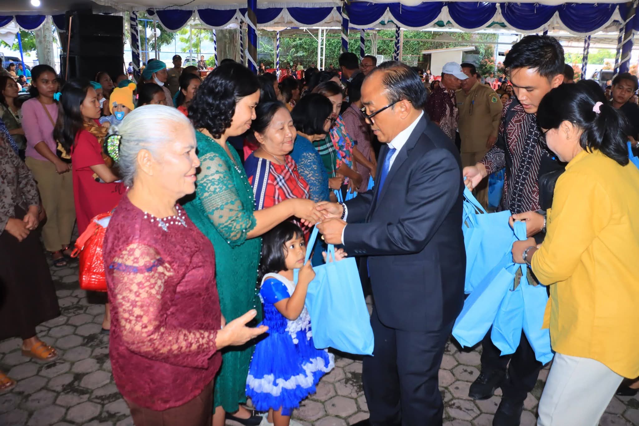 Sebagai bentuk sukacita dan rasa syukur, Wabup membagikan bingkisan kepada masyarakat yang hadir.