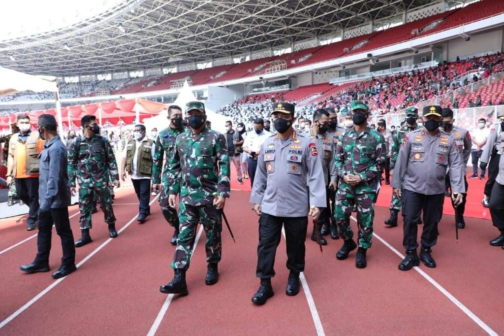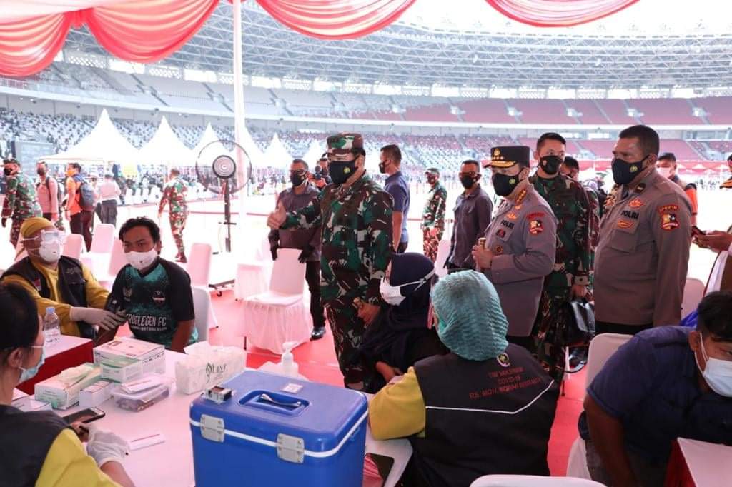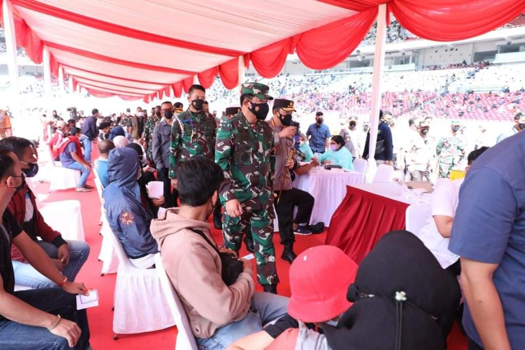 Jakarta, Karosatuklik.com – Panglima TNI Marsekal TNI Hadi Tjahjanto, S.I.P., bersama Kapolri Jenderal Pol Drs. Listyo Sigit Prabowo, M.Si, Gubernur DKI Jakarta Anis Baswedan dan Kepala BNPB Letjen TNI Ganip Warsito, S.E., M.M., meninjau langsung Serbuan Vaksinasi Nasional yang digelar di Stadion Utama GBK (Gelora Bung Karno), Jakarta Pusat, Sabtu (3/7/2021)