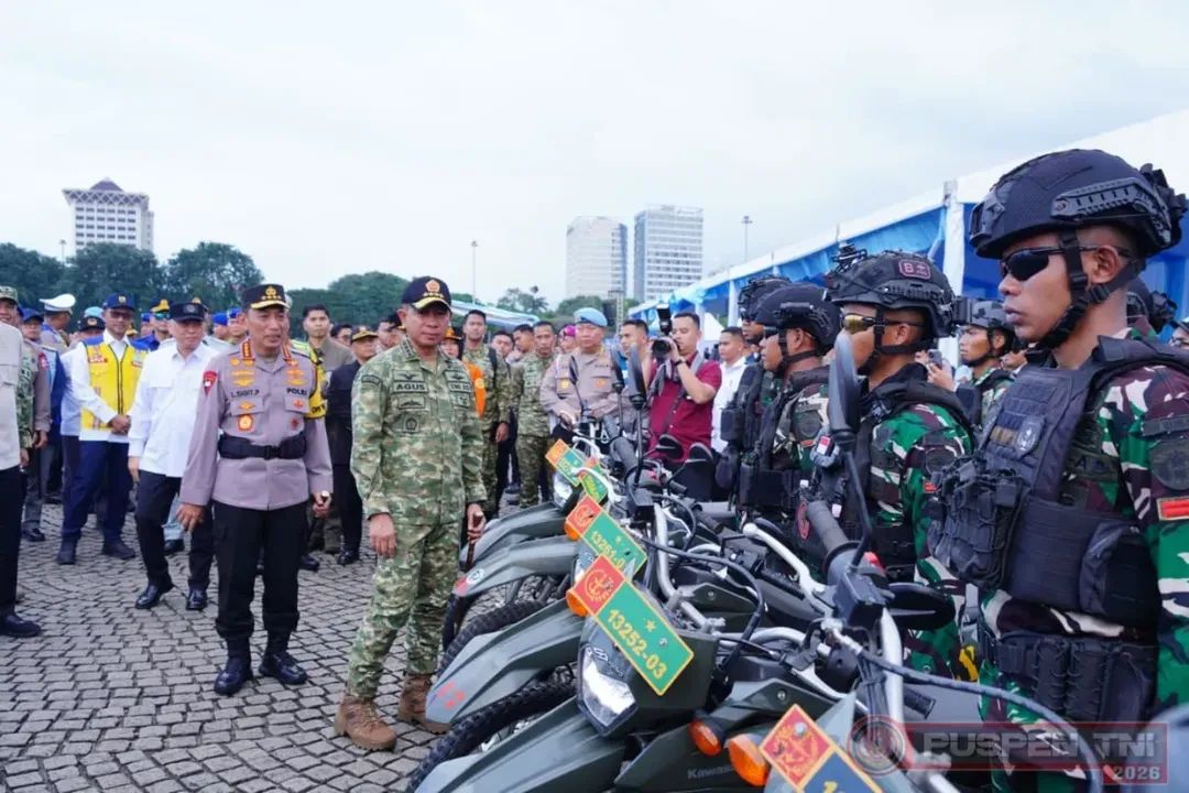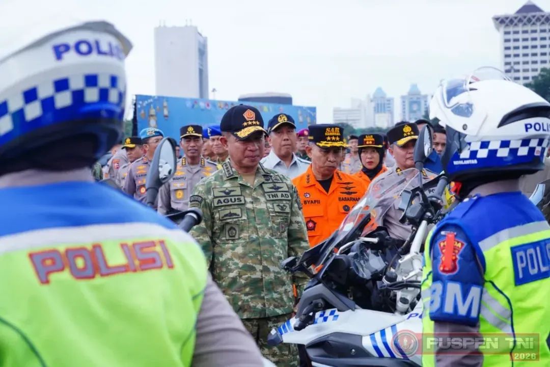 Jakarta, Karosatuklik.com – Panglima TNI Jenderal TNI Agus Subiyanto bersama Kapolri Jenderal Polisi Listyo Sigit Prabowo memimpin Apel Gelar Pasukan Operasi Terpusat “Ketupat 2026” dalam rangka pengamanan perayaan Idul Fitri 1447 H yang turut dihadiri Menkopolkam RI Djamari Chaniago, Menteri Perhubungan RI Dudy Purwagandhi, Kepala Basarnas Marsdya TNI Mohammad Syafii serta Direktur Utama PT. Jasa Raharja Muhammad Awaluddin, bertempat di Lapangan Silang Monas, Jakarta Pusat, Kamis (12/3/2026).