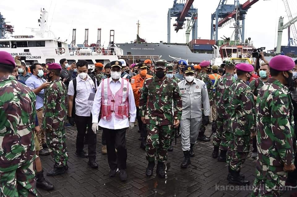 Jakarta, Karosatuklik.com – Panglima TNI Marsekal TNI Hadi Tjahjanto, S.I.P. bersama Menteri Perhubungan (Menhub) Budi Karya Sumadi, Kepala Staf Angkatan Laut (Kasal) Laksamana TNI Yudo Margono, S.E., M.M., Kepala Badan Nasional Pencarian dan Pertolongan (Kabasarnas) Marsdya TNI Bagus Puruhito dan Ketua Komite Nasional Keselamatan Transportasi (KNKT) Soerjanto Tjahjono, menggelar konferensi pers terkait ditemukannya Flight Data Recorder (FDR) pesawat Sriwijaya Air SJ-182, bertempat di Dermaga JICT II, Tanjung Priok, Jakarta Utara, Selasa (12/1/2021).