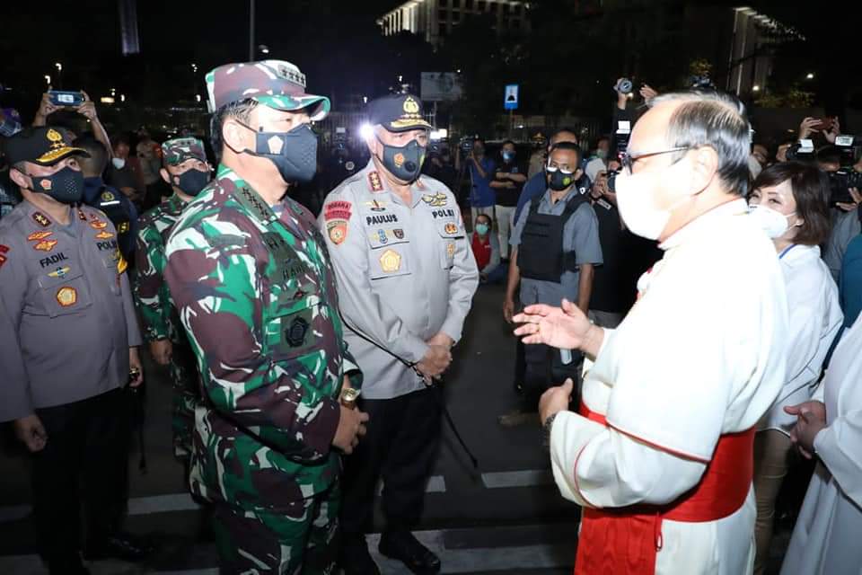 Kedatangan Panglima TNI beserta rombongan di Gereja Katedral disambut olehUskup Agung Jakarta Prof. Dr. Ignatius Suharyo Hardjoatmodjo. Panglima TNI danUskup Agung Jakarta berbincang terkait pengamanan gereja yang dilakukan TNI dan Polri pasca aksi terorisme yang terjadi di Gereja Katedral Makassar dan Mabes Polri Jakarta, beberapa hari yang lalu.