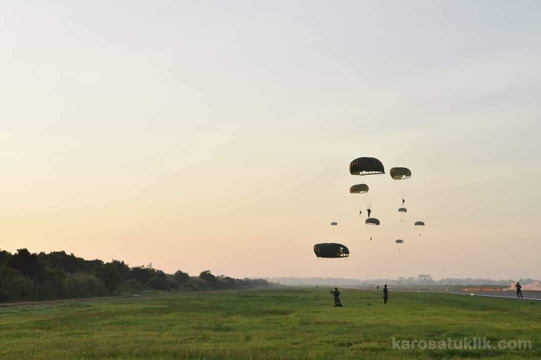 Menggunakan pesawat C-130 Herkules bernomor registrasi A-1321 dari Skadron Udara 31, sejumlah 104 prajurit baret jingga tersebut dibagi menjadi 2 sortie untuk melakukan penerjunan statik dan free fall.