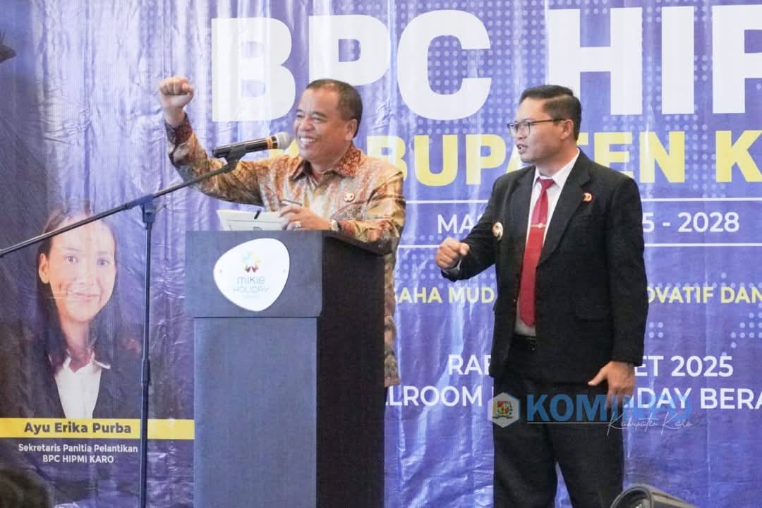 Berastagi, Karosatuklik.com – Bupati Karo, Brigjen Pol (Purn) Dr. dr. Antonius Ginting, Sp.OG., M.Kes, bersama Wakil Bupati, Komando Tarigan, S.P, serta Forkopimda Kabupaten Karo, hadir dalam acara pelantikan Pengurus Badan Pengurus Cabang (BPC) Himpunan Pengusaha Muda Indonesia (HIPMI) Kabupaten Karo. Acara tersebut digelar di Ballroom Mikie Holiday Resort dan Hotel, Berastagi, Rabu (26/3/2025).
