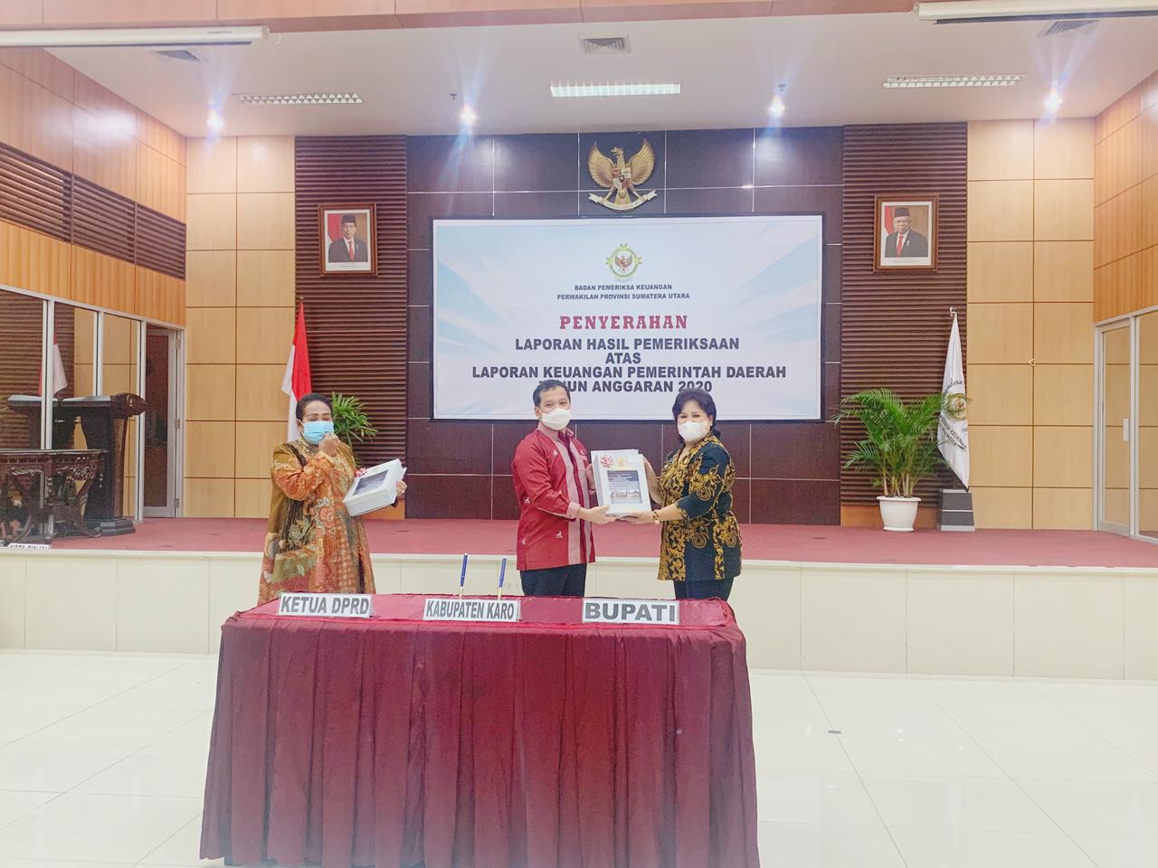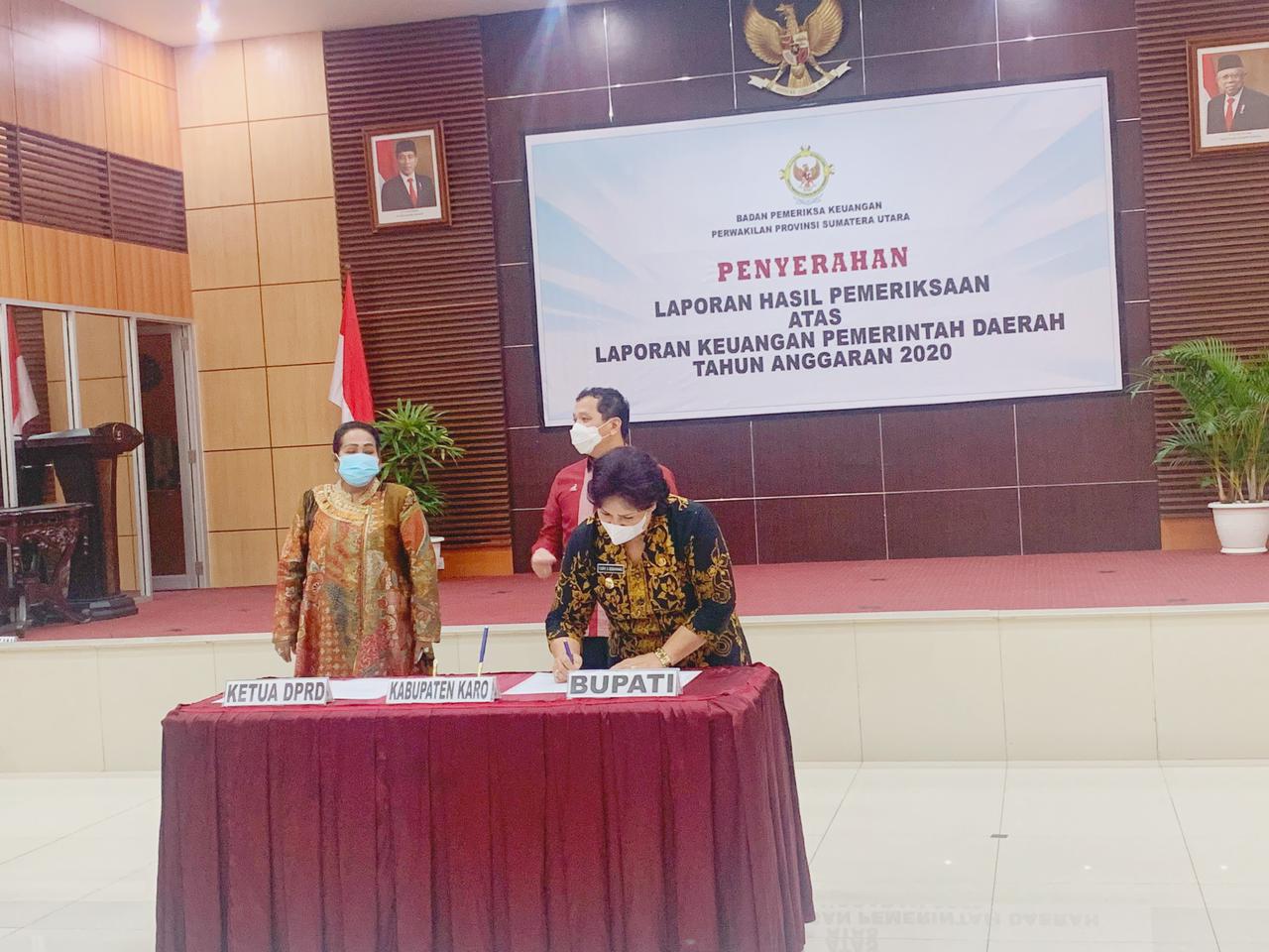 Penyerahan berkas hasil pemeriksaan kepada Bupati Karo Cory Seriwaty Sebayang didampingi Ketua DPRD Karo Iriani Br Tarigan oleh Ketua BPK Perwakilan Sumut Eydu Oktain Panjaitan dan tim audit BPK pada acara penyerahan hasil pemeriksaan atas laporan keuangan pemerintah daerah tahun anggaran 2020.