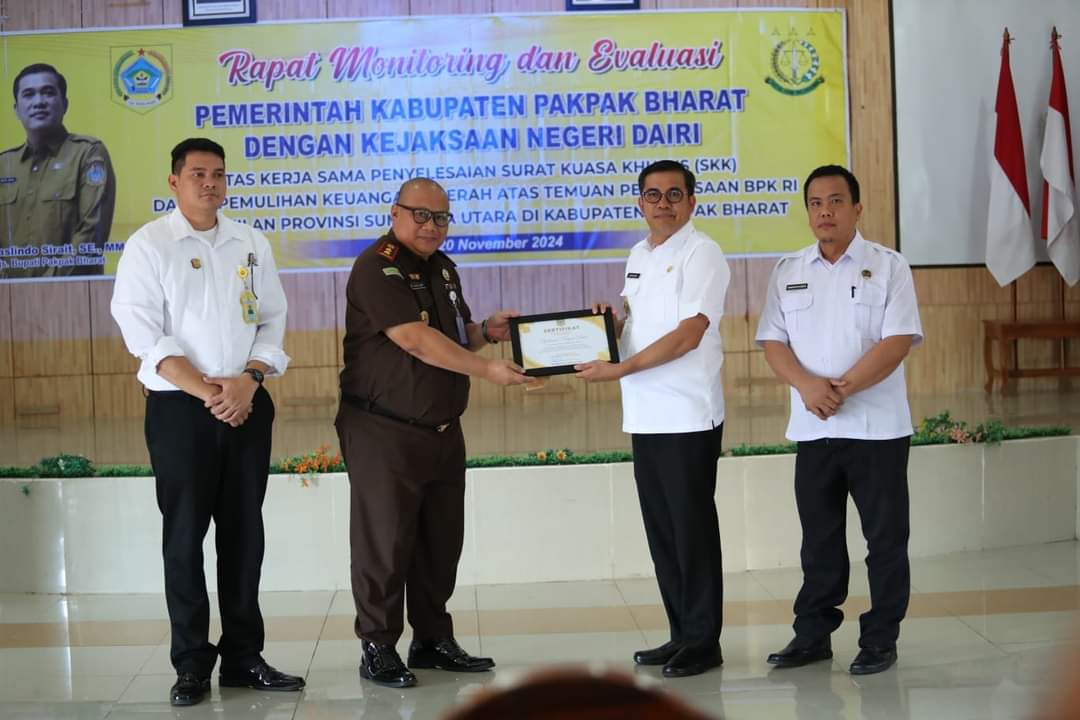 Pjs. Bupati Dr. Naslindo Sirait menyampaikan apresiasi dan terimaksih kepada Kejaksaan Negeri Dairi, atas kinerjanya yang telah menyelesaikan beberapa Surat Kuasa Khusus (SKK) Dalam Pemulihan Keuangan Daerah Atas Temuan Pemeriksaan BPK RI Perwakilan Provinsi Sumatera Utara. Naslindo berharap sinergitas antara Pemerintah Pakpak Bharat dengan Kejaksaan Negeri Dairi yang sudah terjalin dengan baik, bisa terus dpertahankan dan terus ditingkatkan, sehingga kolaborasi ini bisa memberi manfaat bagi kemajuan Kabupaten Pakpak