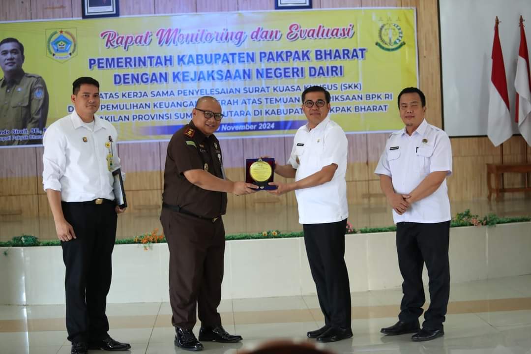 Salak, Karosatuklik.com – Pemerintah Kabupaten Pakpak Bharat Memberikan Penghargaan Kepada Kejaksaan Negeri Dairi sebagai apresiasi atas penyelesaian Surat Kuasa Khusus (SKK) Dalam Pemulihan Keuangan Daerah Atas Temuan Pemeriksaan BPK RI Perwakilan Provinsi Sumatera Utara