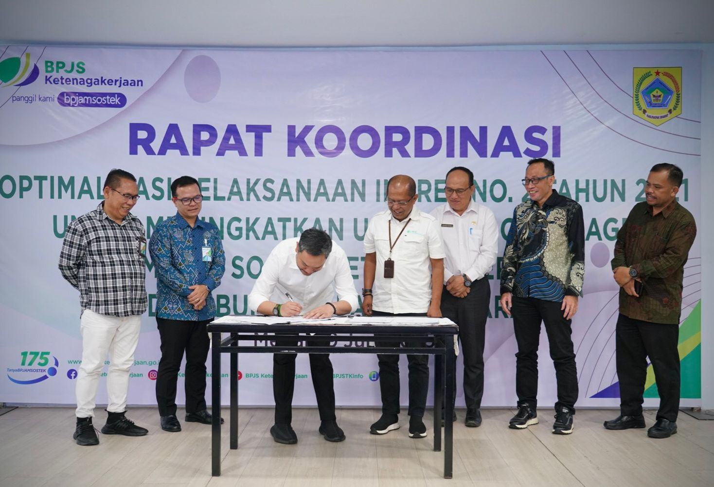 Penandatanganan ini dilaksanakan bersamaan dalam Rapat Koordinasi Optimalisasi Pelaksanaan Program Jaminan Sosial Ketenagakerjaan di Kabupaten Pakpak Bharat di Kantor Wilayah BPJS Ketenagakerjaan Sumbagut, Medan, Rabu (9/7/2025).