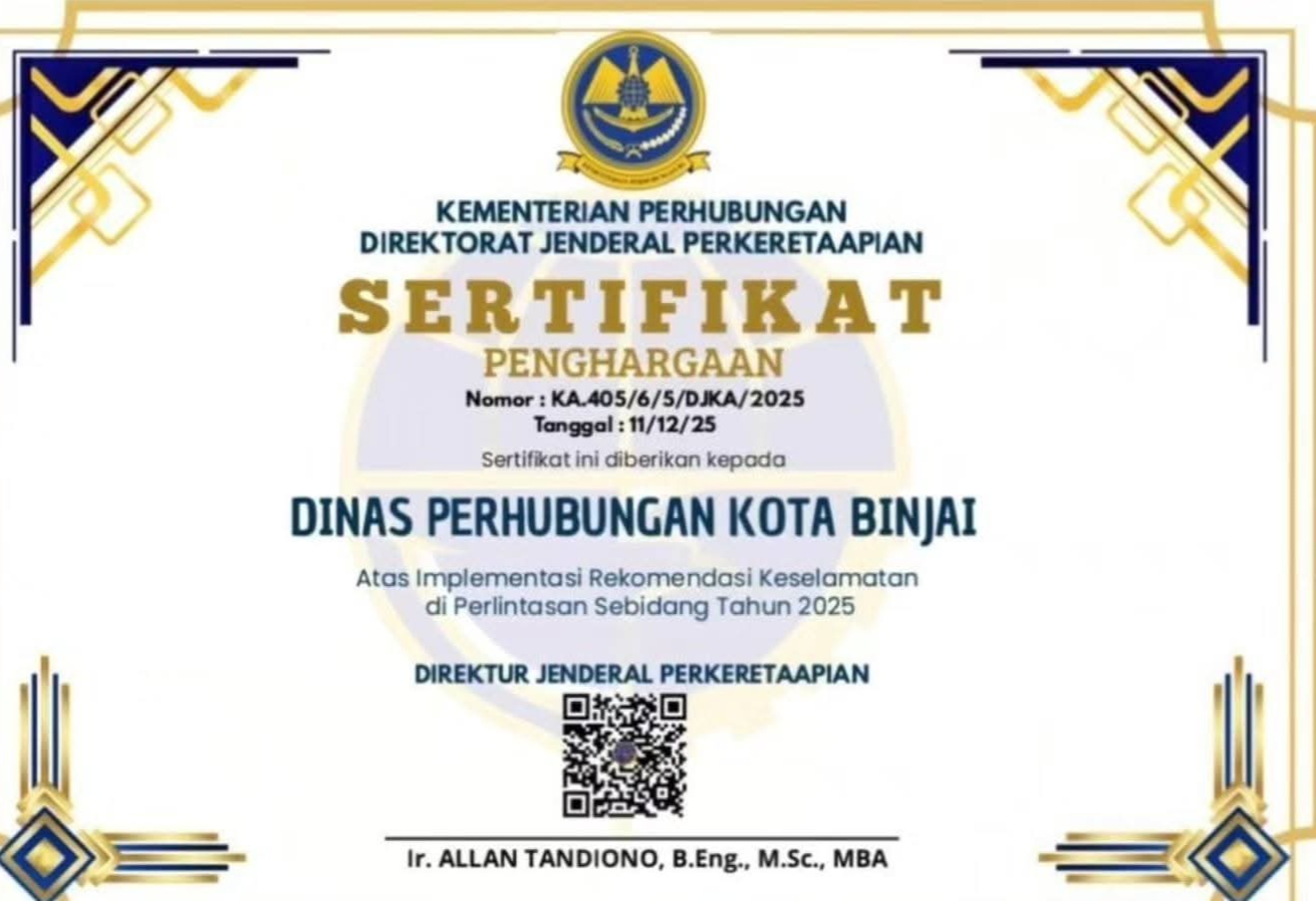 Binjai, Karosatuklik.com – Pemerintah Kota Binjai melalui Dinas Perhubungan (Dishub) Kota Binjai menerima Sertifikat Penghargaan dari Kementerian Perhubungan Republik Indonesia melalui Direktorat Jenderal Perkeretaapian atas keberhasilan dalam mengimplementasikan rekomendasi keselamatan di perlintasan sebidang sepanjang tahun 2025.