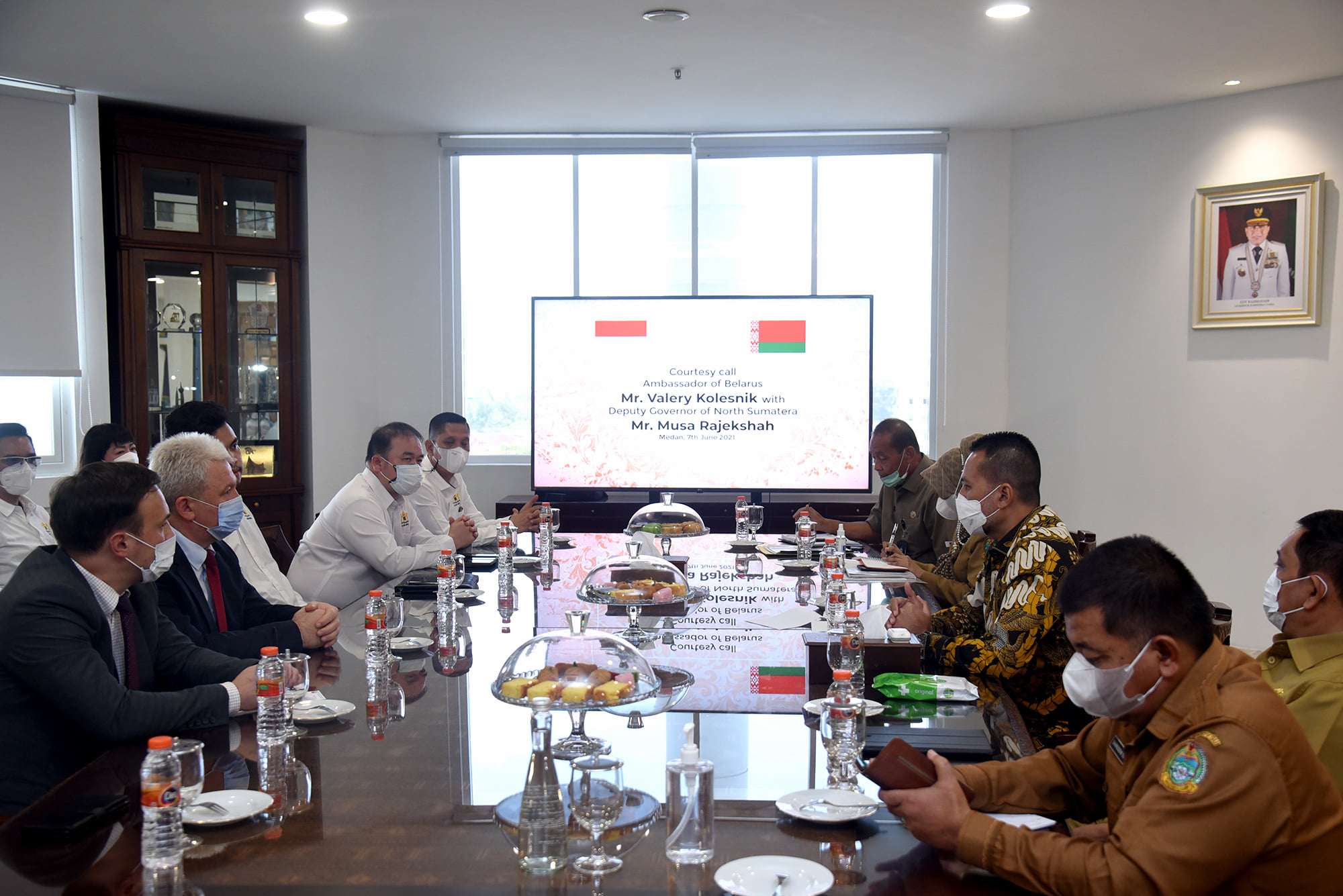 “Kita sangat senang menyambut Belarusia, semoga dengan pertemuan ini akan ada peluang apakah barang atau komoditas Sumut yang bisa diekspor ke Belarusia,” kata Wagub, saat menerima kunjungan Duta Besar Negara Belarusia Valery Kolesnik di Ruang Kerjanya, Lantai 9, Kantor Gubernur Sumut, Jalan Pangeran Diponegoro Nomor 30, Medan, Senin (7/6/2021).