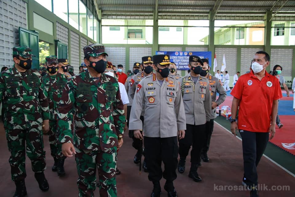 Bali, Karosatuklik.com – Panglima TNI Marsekal Hadi Tjahjanto, S.I.P. selaku Ketua Umum Federasi Karate-Do Indonesia (FORKI) bersama Kapolri Jenderal Polisi Listyo Sigit Prabowo, meninjau Pemusatan Latihan Nasional (Pelatnas) Karate di GOR Jasdam Kodam IX/Udayana, Kepaoen Bali, Kamis (4/2/2021).
