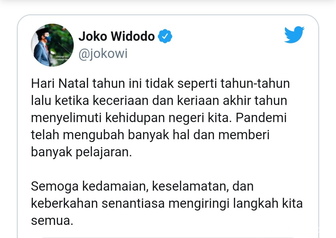 Hari Natal tahun ini tidak seperti tahun-tahun yang lalu ketika keceriaan dan keriaan akhir tahun menyelimuti kehidupan negeri kita,” tulis Jokowi.