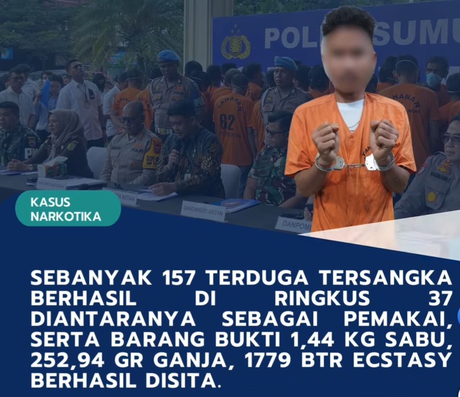 Pengungkapan kasus narkoba di Sumatera Utara dalam sepekan terakhir menunjukkan hasil yang signifikan. Polda Sumut berhasil mengungkap 119 kasus dengan 157 tersangka yang terdiri dari pengedar sebanyak 120 orang dan pengguna sebanyak 37 orang.