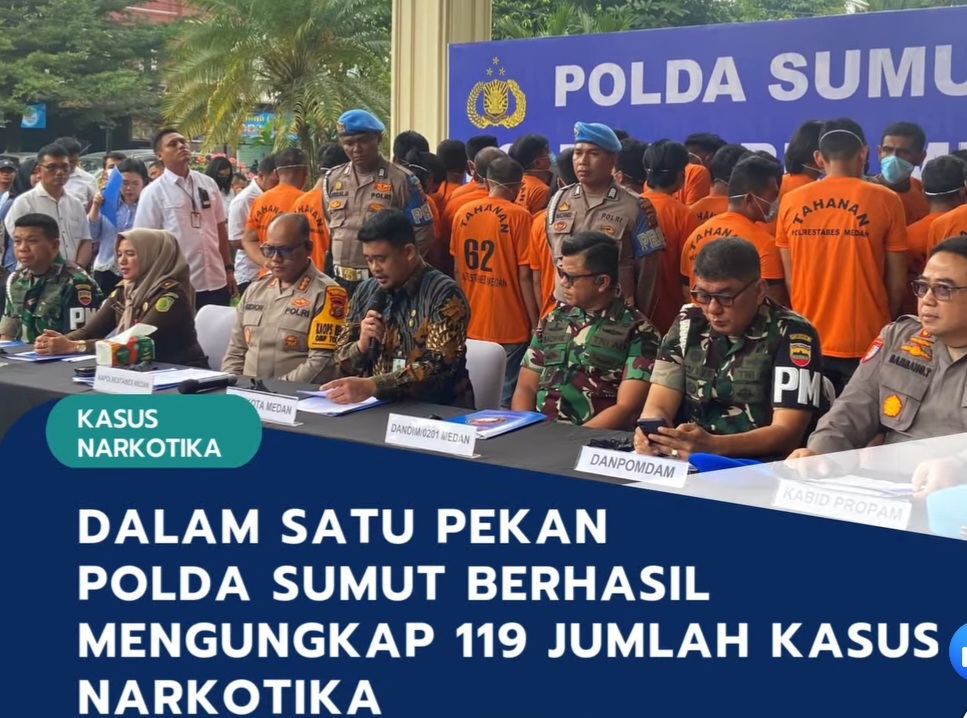 Pengungkapan kasus narkoba di Sumatera Utara dalam sepekan terakhir menunjukkan hasil yang signifikan. Polda Sumut berhasil mengungkap 119 kasus dengan 157 tersangka yang terdiri dari pengedar sebanyak 120 orang dan pengguna sebanyak 37 orang.