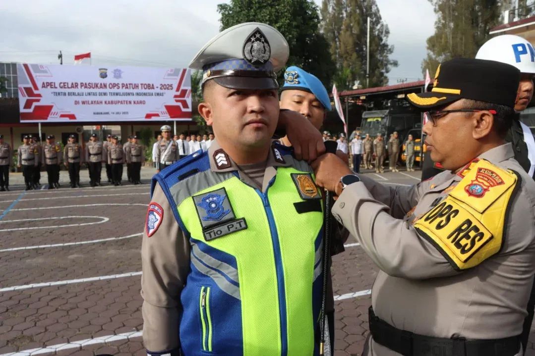 Dalam rangkaian apel, dilakukan pemeriksaan pasukan dan kendaraan operasional, serta penyematan pita tanda dimulainya Operasi Patuh Toba 2025.