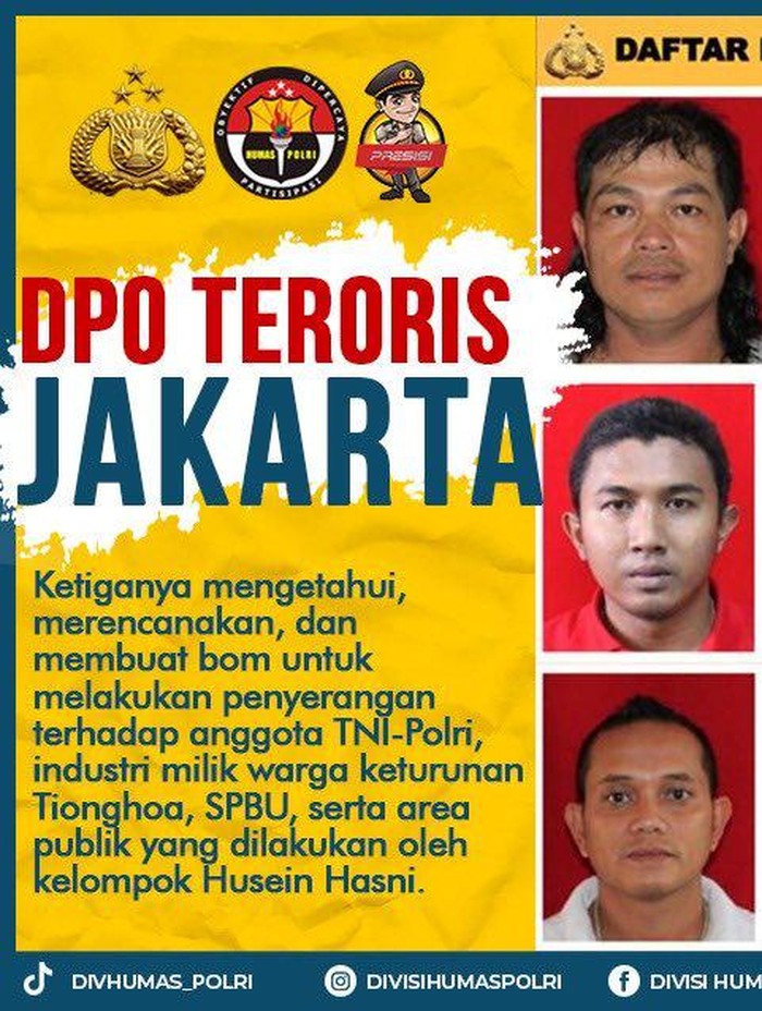 “Merencanakan pengeboman di) industri milik warga keturunan Tionghoa, SPBU, serta area publik yang dilakukan oleh kelompok Husein Hasni,” tulis akun resmi Divisi Humas Polri itu.