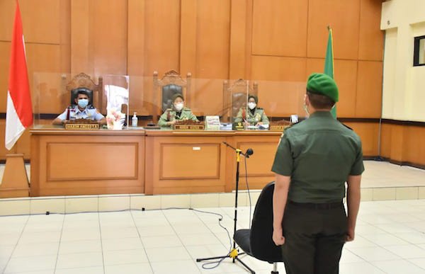Jakarta, Karosatuklik.com – Prada M. Ilham tersangka pelaku utama penyebaran berita bohong yang mengakibatkan penyerangan Polsek Ciracas yang dilakukan oleh 77 orang oknum prajurit TNI pada Agustus Tahun 2020 menjalani sidang pembacaan putusan di Pengadilan Militer II-8, Jakarta Timur, Kamis (29/4/2021).