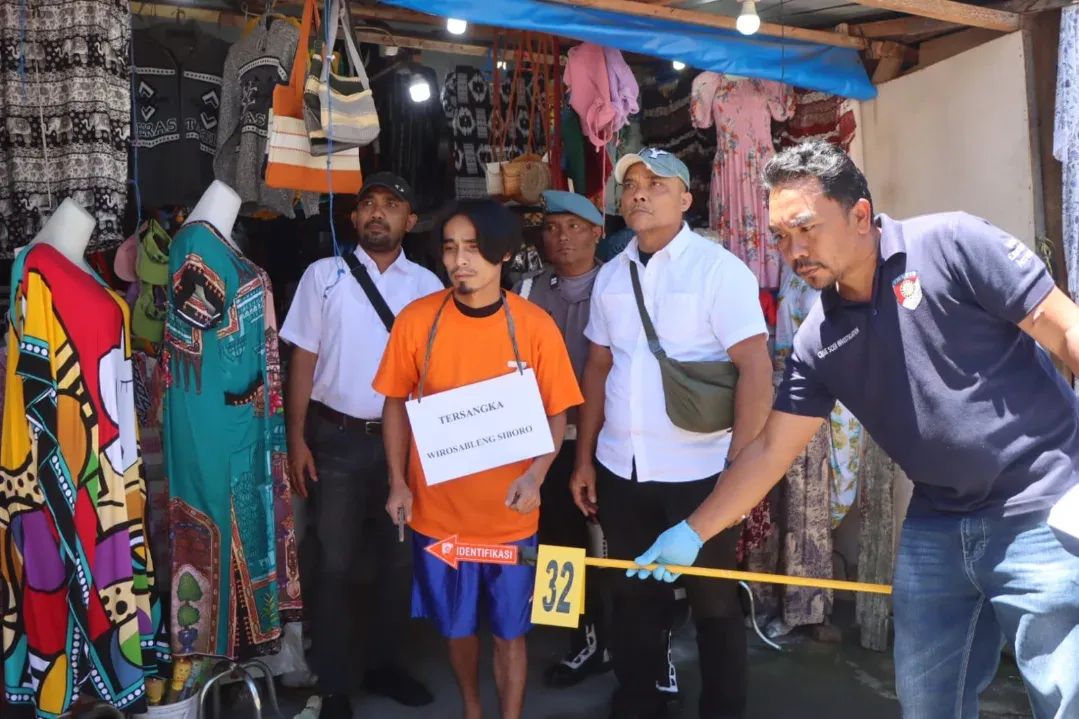 Rekonstruksi digelar di Tempat Kejadian Perkara (TKP), tepatnya di kios milik warga bernama Mak Ika di Jalan Kantor Camat, Kelurahan Gundaling I Berastagi, Selasa (15/9/2025).