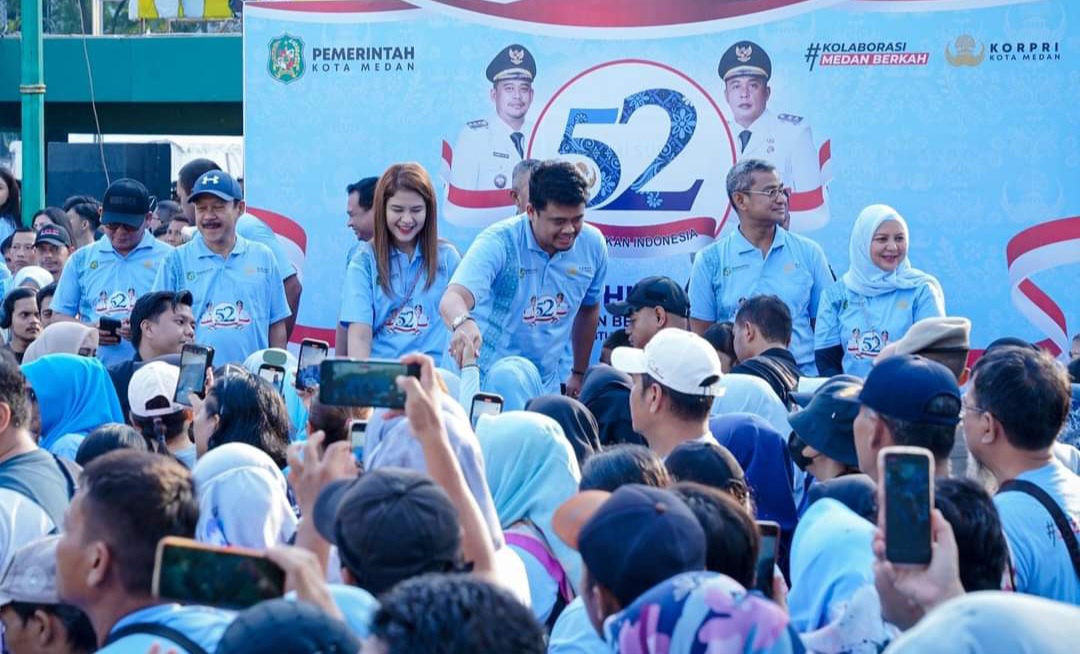 Kemeriahan Gebyar HUT ke-52 Korpri ini semakin bertambah dengan hadirnya Wali Kota Medan Bobby Nasution bersama Ketua TP PKK Kota Medan Kahiyang Ayu Bobby Nasution.