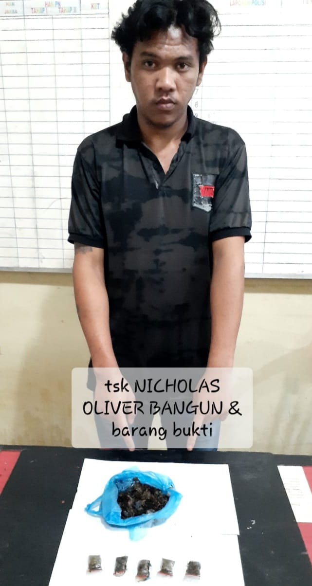 Dari hasil penggeledahan, tutur Hendri Tarigan, ditemukan barang bukti berupa narkotika jenis ganja dalam keadaan bekas terbakar yang yang dibungkus plastik assoy seberat bruto 36,57 (tiga puluh enam koma lima tujuh) gram bersamaan 5 (lima) paket/am dalam plastik klip berles merah masing-masing berisikan narkotika jenis ganja seberat bruto 13,45 (tiga belas koma empat lima) gram yang terbakar didepan Nicholas Oliver Bangun berdiang pada saat dilakukan penangkapan, sebutnya.