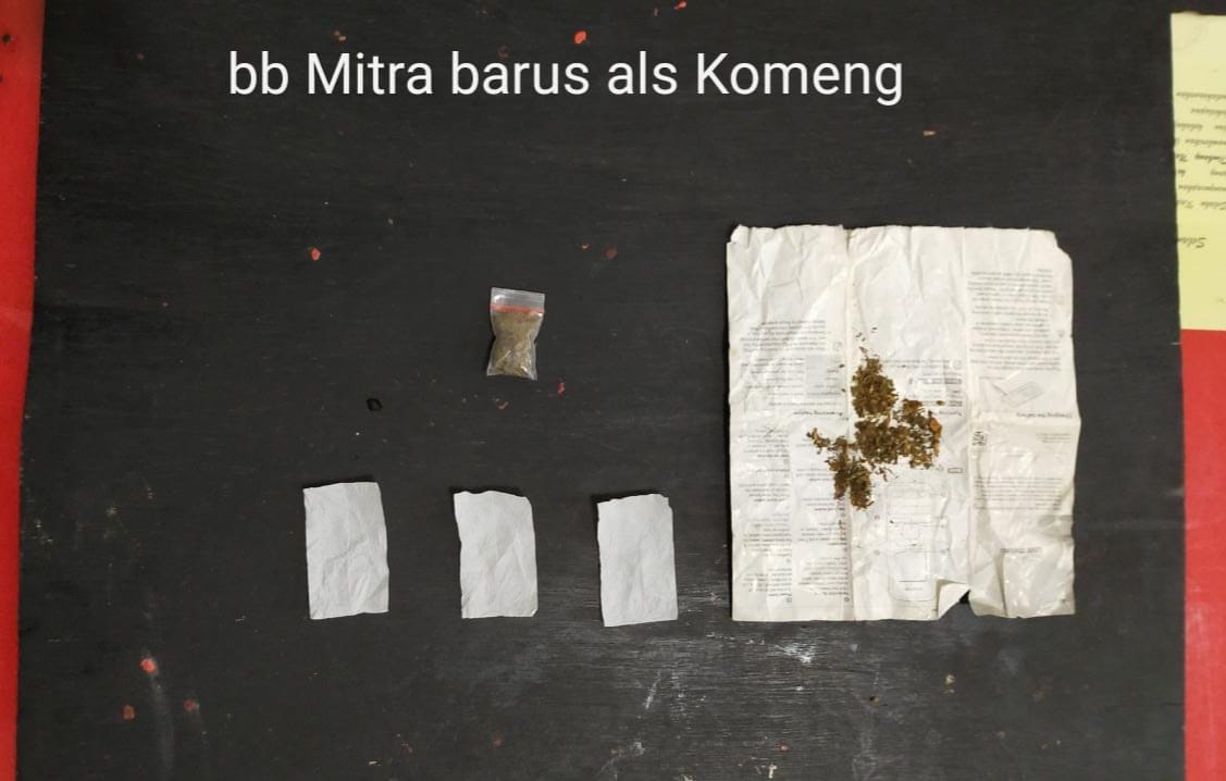 Dari hasil penggeledahan yang dilakukan, ditemukan barang bukti berupa narkotika jenis ganja dalam keadaan kering seberat netto 0,68 (nol koma enam delapan) gram, 1 (satu) paket/ am dalam plastik klip berles berisikan diduga narkotika jenis ganja seberat netto 1,32 (satu koma tiga dua) gram dan 3 (tiga) lembar lembar kertas tiktak warna putih yang keseluruhan dibungkus dengan kertas berwarna putih di dalam genggaman tangan kanan Mitra Barus alias Komeng pada saat dilakukan penangkapan, ujarnya.