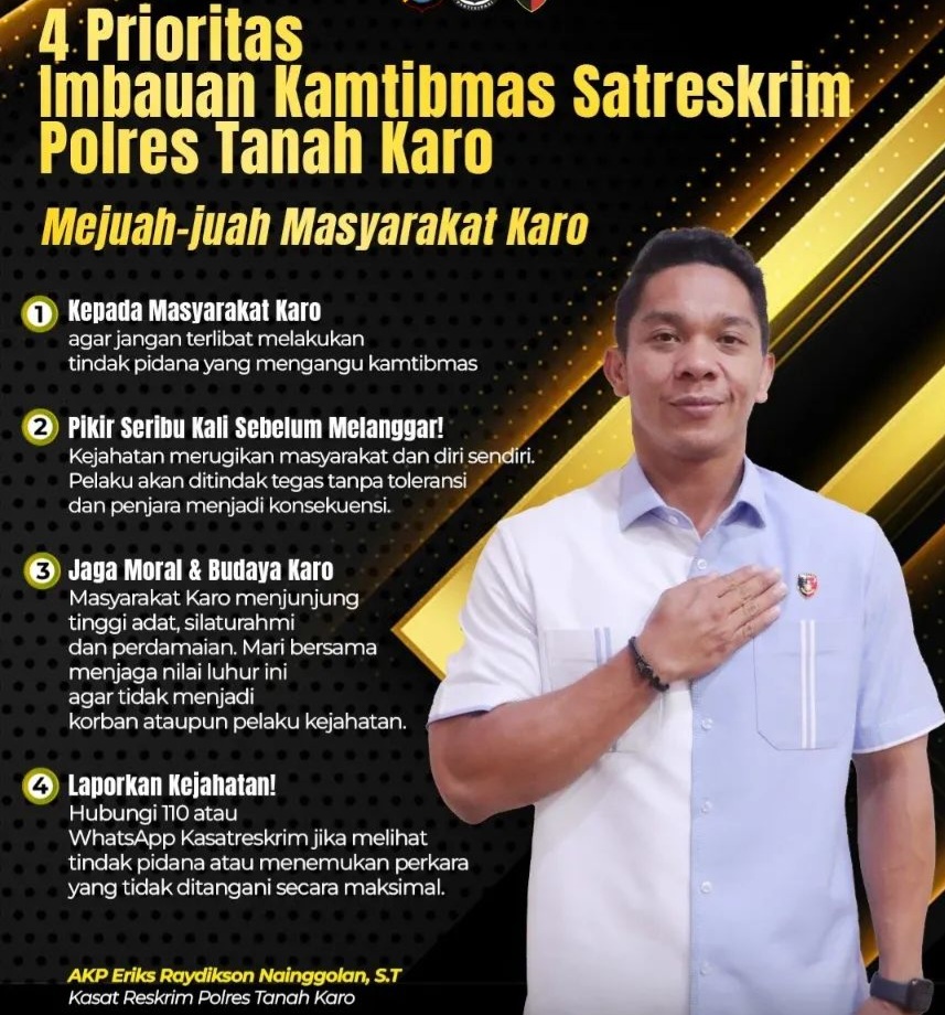 Kabanjahe, Karosatuklik.com – Dalam upaya menjaga keamanan dan ketertiban masyarakat (Kamtibmas), Satuan Reserse Kriminal (Satreskrim) Polres Tanah Karo menyampaikan empat prioritas himbauan kepada seluruh masyarakat di Kabupaten Karo.