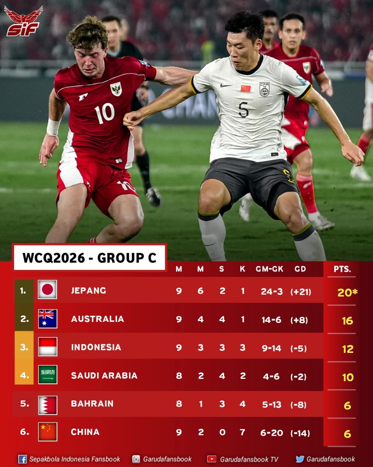 Dengan menyisakan satu laga, Indonesia juga mustahil menggeser Timnas Australia di posisi dua yang mengoleksi 16 poin. Di sisi lain, Arab Saudi masih mungkin mendongkel The Socceroos asalkan bisa mengalahkan sang lawan dengan skor telak minimal 5-0 pada Selasa 10 Juni 2025.