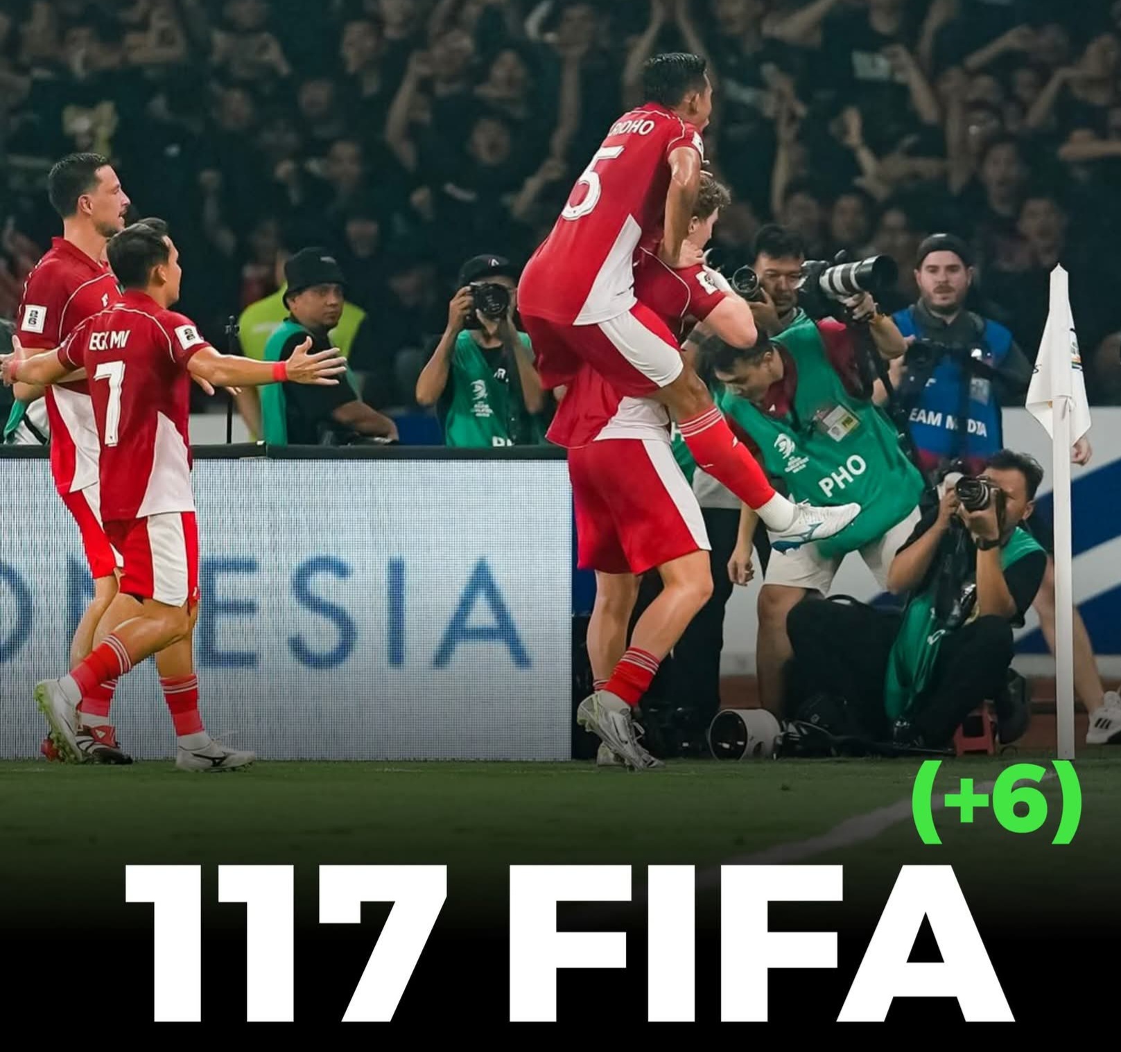Tim Merah Putih kini memiliki poin 1157,98. Timnas Indonesia kini naik 6 peringkat ke posisi 117 dunia.