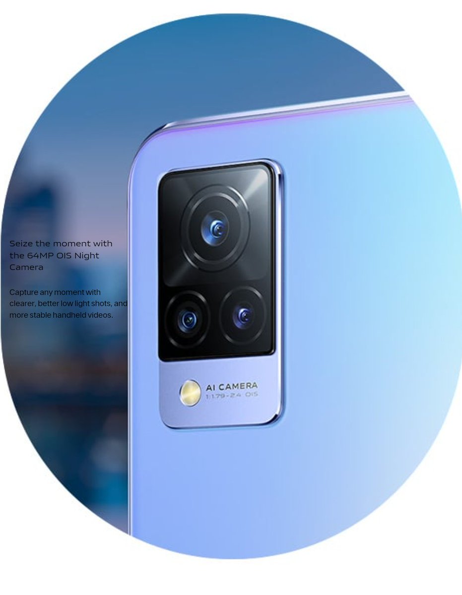 Untuk foto dan video, Vivo V21 5G memiliki tiga kamera belakang terdiri dari sensor utama 64MP, wide-angle 8MP, dan makro 2MP. Kamera belakang juga dipasangkan dengan modul lampu kilat LED dan dukungan OIS.