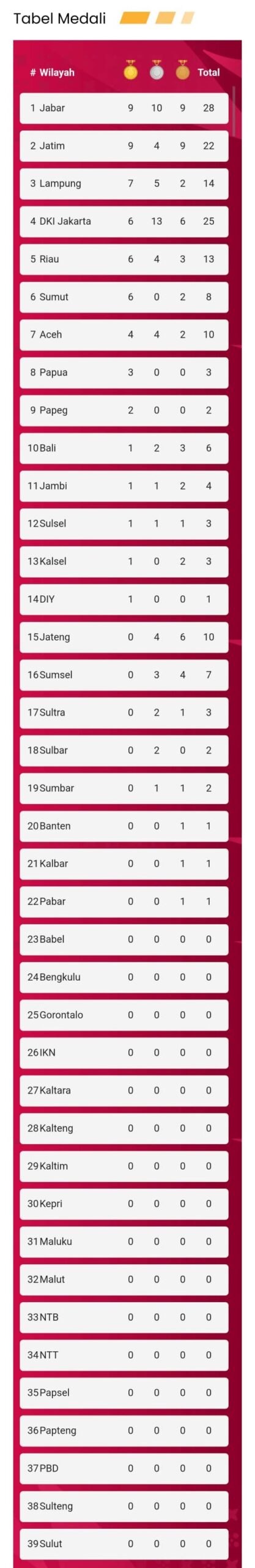 Kemudian diikuti DKI Jakarta dengan total medali 25 dan Riau 13 medali. Sedangkan Sumut sebagai tuan rumah PON XXI, masih menduduki peringkat 6 klasemen sementara dengan koleksi 6 emas, nol perak dan dua perunggu.