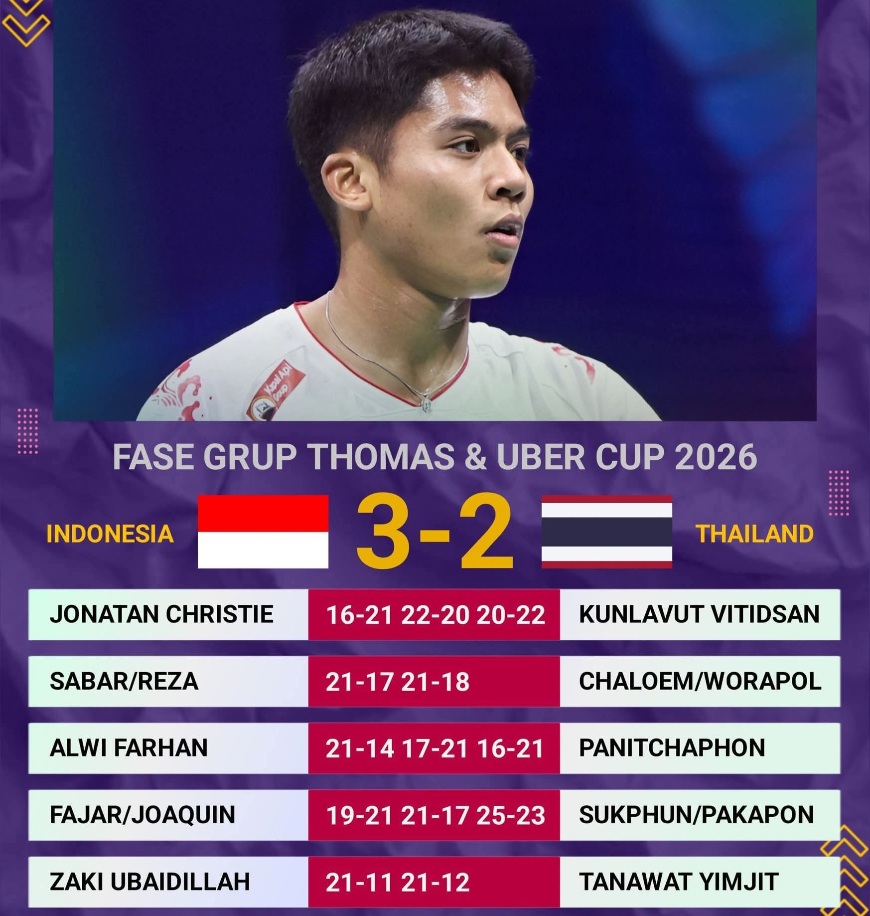 Dengan kekalahan Jonatan Christie tersebut, Tim Piala Thomas Indonesia sementara tertinggal 0-1 dari Thailand.