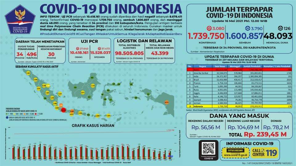 Dengan begitu, total akumulatif ada 1.739.750 orang yang hingga saat ini terkonfirmasi positif terinfeksi virus Corona yang menyebabkan Covid-19 di Indonesia.