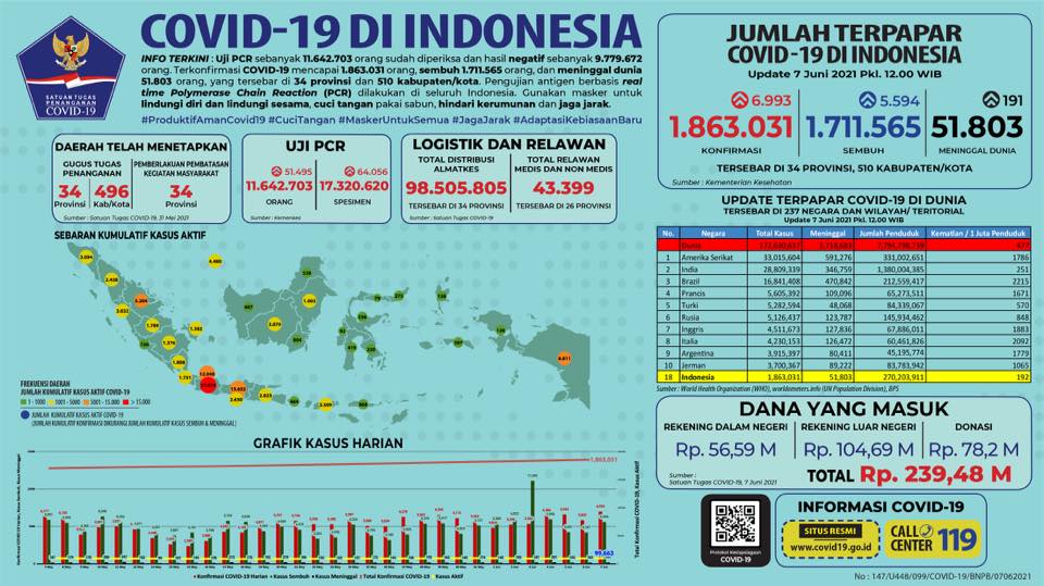 Pada hari ini, Senin (7/6/2021), terdapat 6.993 orang yang dinyatakan positif terinfeksi Covid-19.