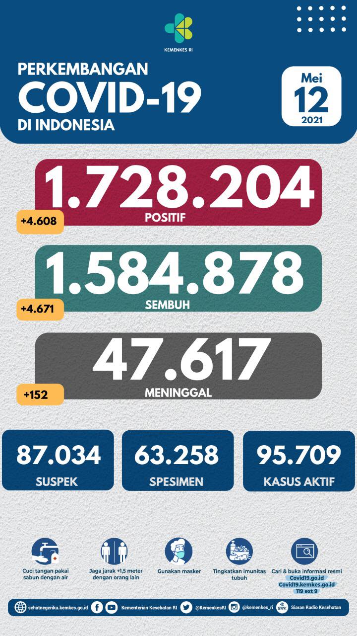 Jakarta, Karosatuklik.com – Satuan Tugas Penanganan Covid-19 mengumumkan pasien positif Covid-19 di Indonesia kembali bertambah sebanyak 4.608 orang pada satu hari jelang Hari Raya Idul Fitri atau Rabu (12/5/2021). Kekinian total kasus menjadi 1.728.204 orang.