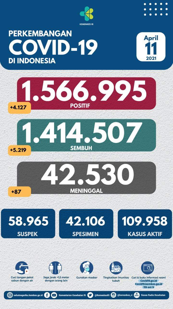 Data dari Satuan Tugas (Satgas) Penanganan Covid-19 hingga Minggu (11/4/2021) malam, menunjukkan, ada penambahan 4.127 kasus baru Covid-19 dalam 24 jam terakhir.