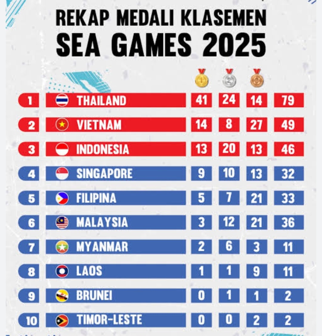 Bangkok, Karosatuklik.com – Hasil perolehan medali SEA Games 2025 menunjukkan, Thailand masih memimpin klasemen sementara hingga hari ini Jumat (12/12/2025) Pukul 15.30 WIB. Negeri Gajah Putih tercatat mengoleksi 45 emas, 28 perak, dan 14 perunggu, membuat mereka kokoh di posisi teratas