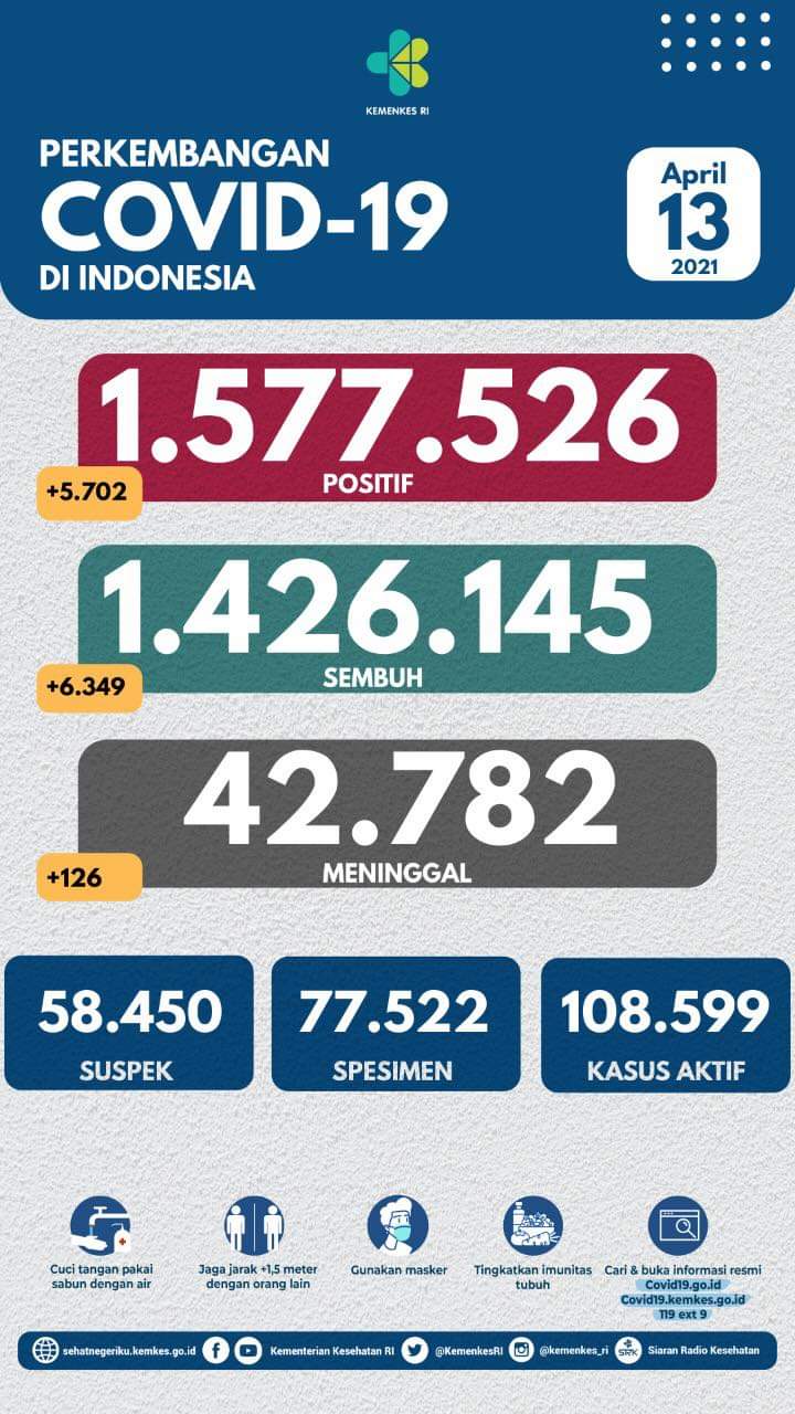 Per Selasa (13/4/2021) jumlah kasus positif Covid-19 bertambah 5.702 kasus.