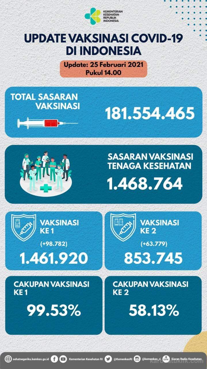 Jakarta, Karosatuklik.com – Sebanyak 1.616.165 orang di Indonesia telah divaksinasi Covid-19 atau bertambah 32.584 penduduk dari hari sebelumnya, sebagai upaya membentuk herd immunity atau kekebalan kelompok terhadap virus SARS-CoV-2.