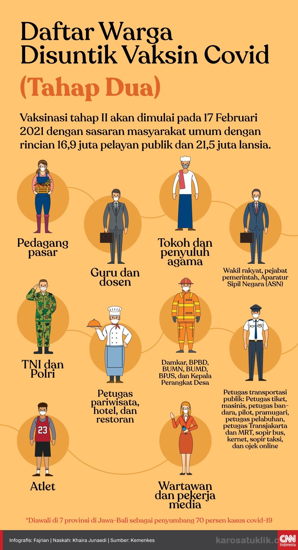 Adapun sebagaimana diketahui vaksinasi Covid-19 tahap dua akan dimulai pada Rabu (17/2) besok dengan pilot project di Pasar Tanah Abang, DKI Jakarta. Sasaran vaksinasi tahap dua ini yakni 16,9 juta petugas publik, dan 21,5 juta lansia. Vaksinasi akan terlebih dulu dilakukan di tujuh provinsi di Pulau Jawa-Bali. (cnnindonesia.com)