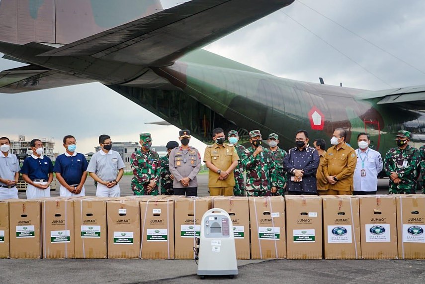 Pesawat jenis Hercules C-130 dengan Pilot Mayor Pnb Aleg Chandra dari Skadron 31 Lanud Halim Perdanakusuma membawa 175 koli bantuan alat kesehatan terdiri dari alat oksigen konsentrator dan selang Nasal Cannula untuk 2 wilayah di Sumatera, yaitu Padang dan Medan.
