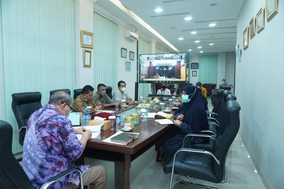 Virtual meeting dilaksanakan di Ruang Kerja Walikota Tebingtinggi yang juga dihadiri Kadis Sosial Drs. Khairil Anwar, M.Si., Plt. Kepala BPBD Drs. Wahid Sitorus, Kadis Perhubungan Manahan Guntur Harahap, S.STP. M.Si., Plt. Kasatpol PP YB. Hutapea.
