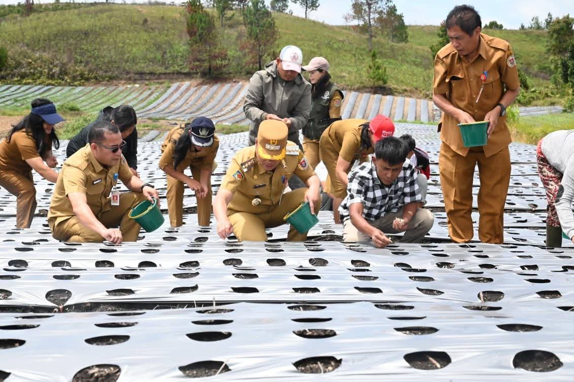 Doloksanggul, Karosatuklik.com – Bupati Humbahas Dr Oloan P Nababan SH MH bersama KT (Kelompok Tani) “Subur Rabang Nauli” di Desa Parsingguran I dan Kelompok Tani “Dosroha” Desa Hutapaung berlokasi di Desa Parsingguran II Kecamatan Pollung, sama-sama melakukan penananam benih bawang putih, Senin 15 September 2025.